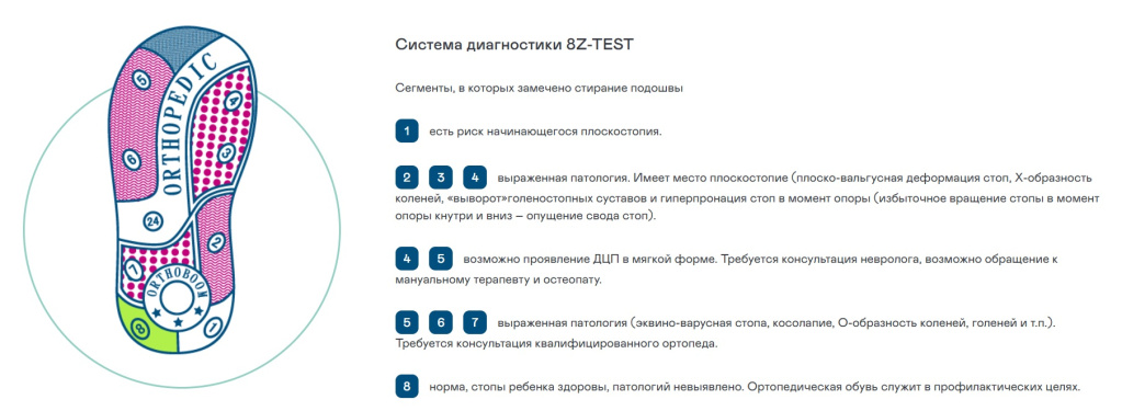 Система 8Z-TЕST - система домашней диагностики на подошве с цифрами. Цифры обозначают зоны стирания. По степени изношенности подошвы в той или иной зоне можно судить о том, правильно ли идет развитие стопы малыша.